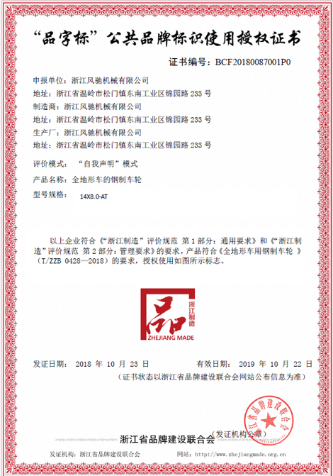 我司是在去年積極響應浙江制造品牌建設,在完成上一階段浙江制造團體標準《全地形車用鋼制車輪》(T/ZZB 0428-2018)的申報、審批與發布實施后,在此基礎之上,于2018年9月份申報了“品字標公共品牌標識”,通過“自我申明”評價模式及資質審核,順利通過評審,獲得了“品字標”公共品牌標識使用證書。